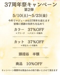 majeur 37周年キャンペーン② Tweet 2025.05.08 by majeur こんにちは😊 5月になりましたね🍃 良い季節ですが、これから暑くなってきますね💦 37周年キャンペーン第2弾です!! お早めのご予約をおすすめします 期間中は現金のみの取り扱いとさせて頂きます 皆様のご来店をお待ちしております♪♪