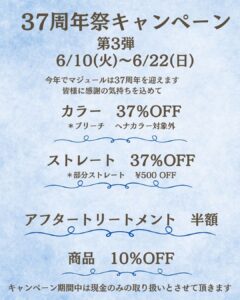 majeur 37周年キャンペーン第3弾⭐️ Tweet 2025.06.10 by majeur こんにちは😊 6月に入り、梅雨のジメジメした季節になりましたね 今日から始まりました〜 37周年キャンペーン第3弾です‼️ 6/22(日)までです♪ 皆さまのご来店をお待ちしております‼️
